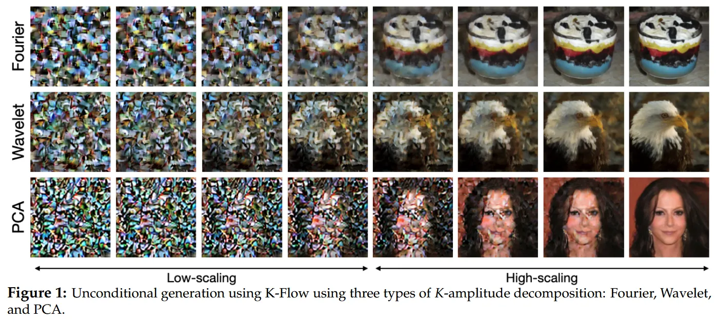 论文里用了三种例子:Fourier、Wavelet 和 PCA。Fourier 提供经典频率空间,Wavelet 给出同时具备尺度局部性和空间局部性的表示,PCA 则是一种数据依赖的分解方式。换句话说,K-Flow 的本质不是”wavelet flow”或”Fourier flow”,而是一个更一般的框架。只要我们能把数据拆成一组有序的尺度成分,并且这个变换是可逆的,K-Flow 就能工作。这赋予了K-Flow极大的灵活性,可被认为是在范式层面的本质创新。