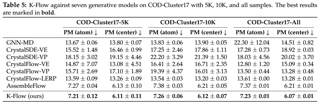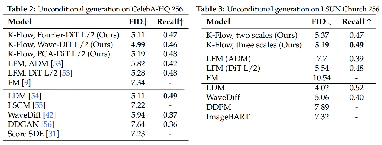 从结果上看,K-Flow 不只是一个”概念上很美”的故事。论文在 CelebA-HQ 256 上,wavelet 版本的 K-Flow 做到了 4.99 的 FID,优于同 backbone 的 latent flow matching(5.28)和 WaveDiff(5.94);在 LSUN Church 256 上,三尺度 wavelet K-Flow 达到 5.19 FID / 0.49 Recall,也优于对应的 LFM 基线(5.54 / 0.48)。在 ImageNet 类条件生成里,Fourier 版本加 CFG 后的 FID 是 2.77,和 LFM 的 2.78 基本持平,但 CDR 更低(1.49 vs. 3.25),说明它在”条件该不该贯穿全程”这件事上更有尺度感。科学任务上,在 COD-Cluster17 的 molecular assembly 上,K-Flow 也在三个数据规模下稳定超过了 AssembleFlow 等基线,full set 上 PM-center 做到 6.07,而 AssembleFlow 是 6.21。