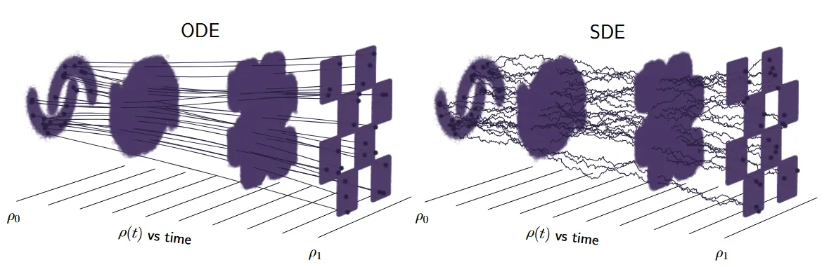 Flow matching和Diffusion这一类针对连续数据(如图像)的生成模型,本质上解决的数学问题是:如何将一个简单的已知先验的分布(比如高斯分布)映射到一个复杂的高维数据分布(如真实图像分布)。在这个过程中,引入时间变量t的作用是把比较困难的一步非线性映射,切分成连续的空间中的无穷(或者大量)个简单、局部的变换(可以是线性或者非线性,但需要足够简单)。