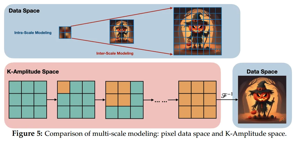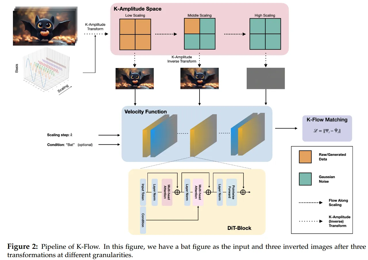 K-Flow真正的创新点,不止是把数据放入Fourier、Wavelet或者PCA空间来观察不同频段,而是提出了一套更本质的生成视角:用尺度参数k来组织不同的band,构建amplitude这个物理量来描述这些band上的系数范数,最后让生成的过程沿着这条K-amplitude的轴来流动(区别于传统diffusion、flow matching的时间变量t)。