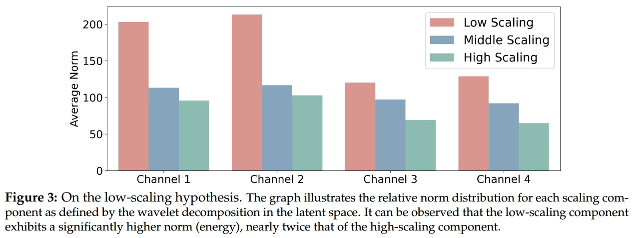 论文里我们做了一个隐空间里频率和尺度的小实验。在 wavelet 分解下,低尺度分量的平均范数明显高于高尺度分量,甚至接近后者的两倍,这意味着低尺度部分往往承载了更多主导性的结构信息。这一点和自然图像的客观规律(1/f)很符合:随着k(amplitude)(这里可以理解为频率)的增加,振幅和能量会迅速衰减。这意味着低频分量包含了一个信号中绝大部分的信息内容和能量。也就是说,即使图像数据被高度压缩到了隐空间,这种类似于 1/f 的”低频能量大、高频能量小”的缩放不均匀性依然存在。(这也启发了我们未来可以尝试从频率和尺度出发,指导生成模型的资源分配和更高效率的生成。)