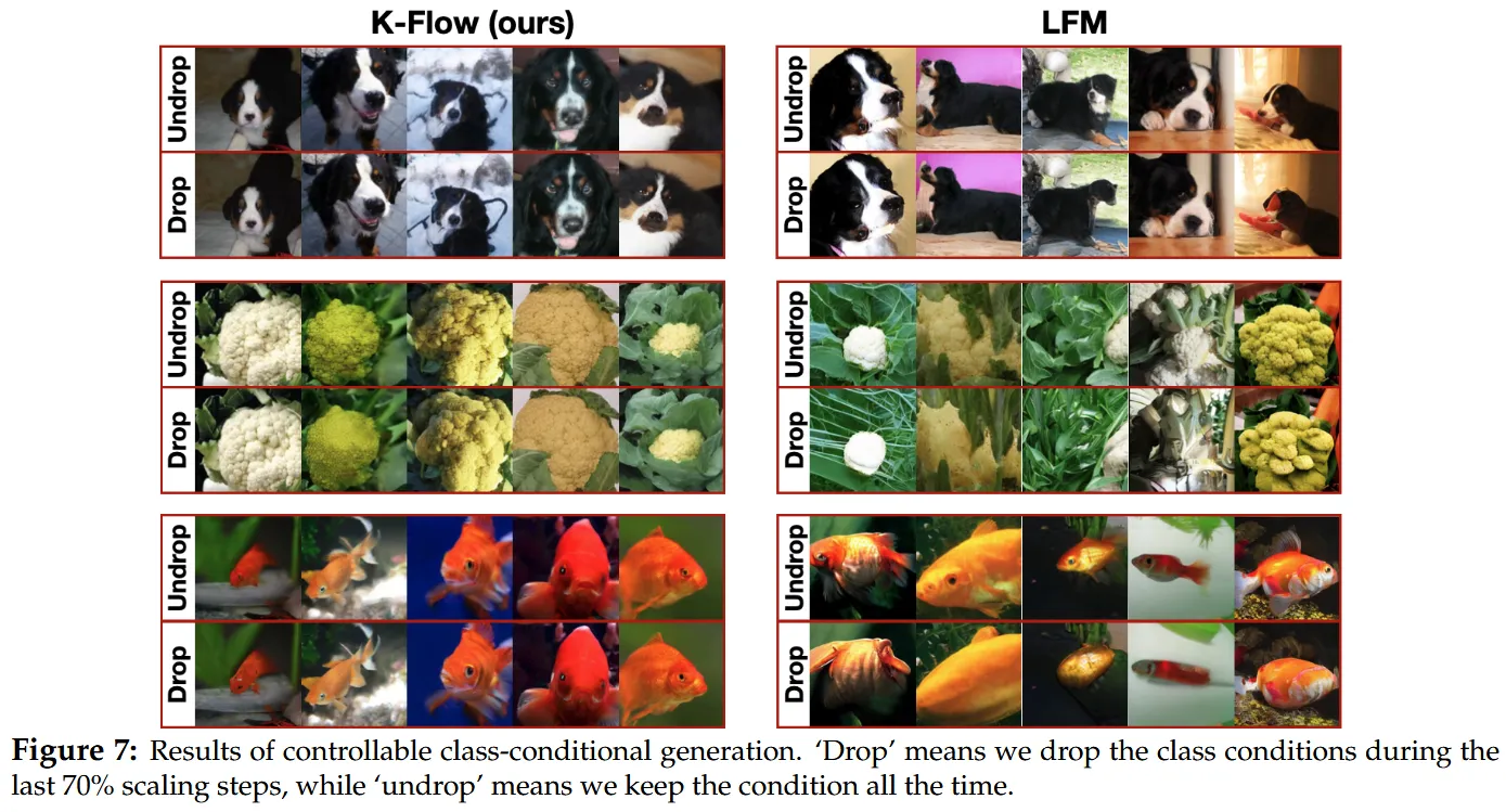 我们做了一个实验,在类条件生成中只保留前段尺度的类别条件,把后段尺度的条件去除。结果是,K-Flow 在后 70% 的尺度步骤中去除类条件之后,仍然能较好保住高频细节;相比之下,普通 latent flow matching 更容易使整张图出现模糊。这说明在 K-Flow 里,不同阶段确实承担不同层级的信息加工,而不是所有语义和细节都混在一起。