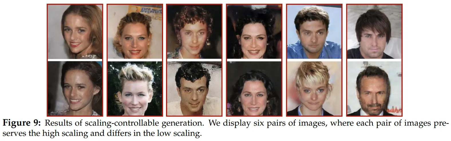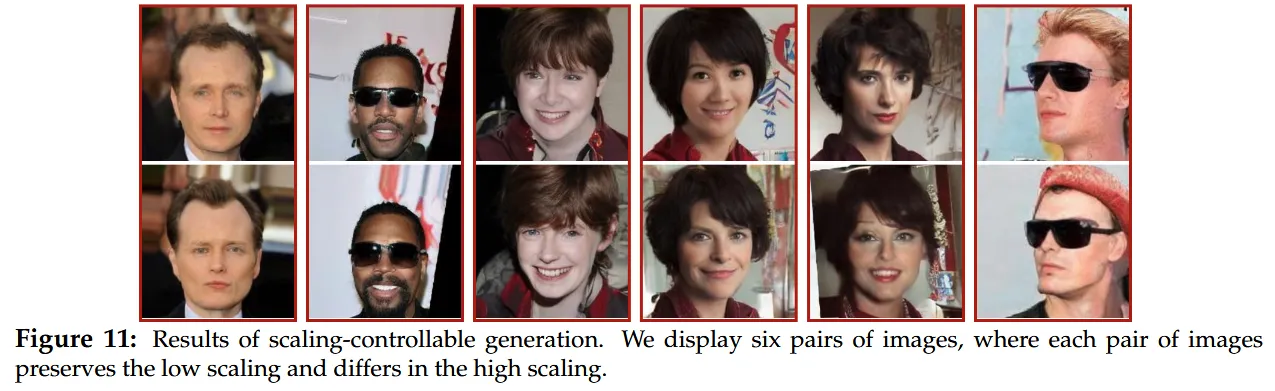 更直观的是尺度可控生成实验的结果。固定高尺度噪声时,模型生成的人脸会保留相似的眼睛、鼻子、眉毛等局部细节,但背景、年龄、发型这类低尺度上下文会发生变化;反过来,固定低尺度噪声时,背景和整体属性更稳定,高分辨率表情与外观细节则可以被编辑。也就是说,K-Flow 不是在抽象意义上”支持控制”,而是在视觉上的确能够区分展示”低尺度”和”高尺度”。